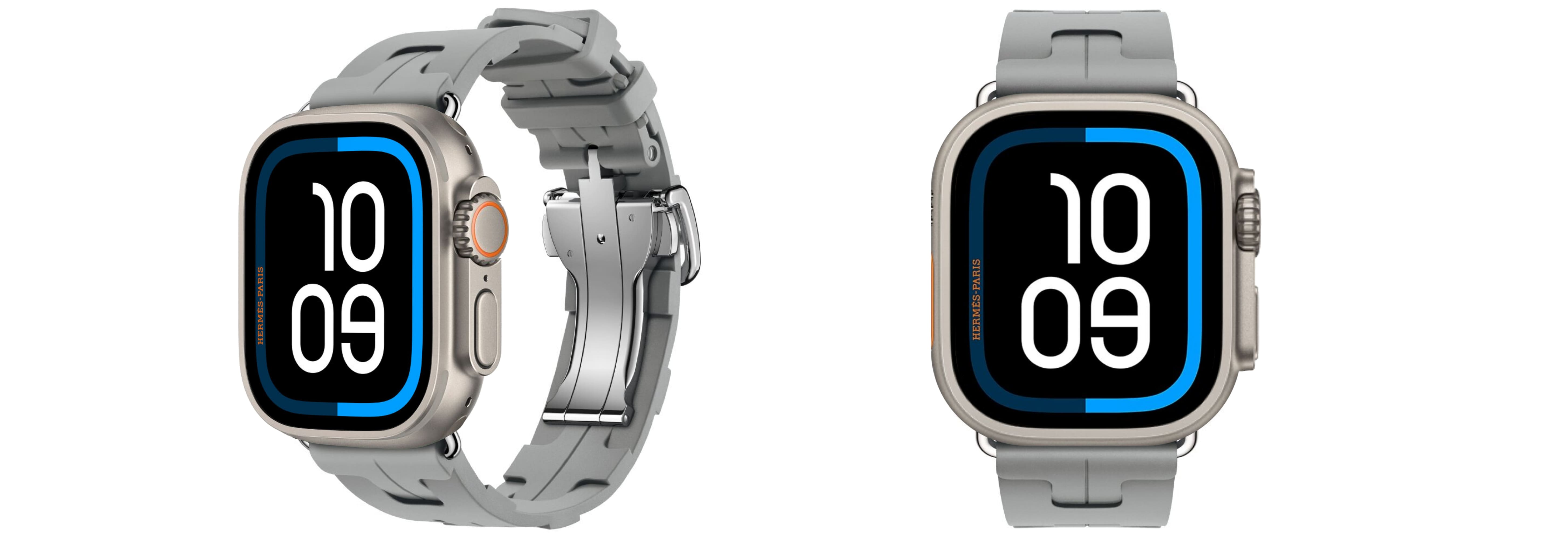 - Hermès-ремешки (Ultra 3, 49 мм): Scub’H Diving (Single Tour, высокопроизводительный эластомер, титановые пряжки); En Mer (Ultra Single Tour, водостойкий трикотаж с узором волны).