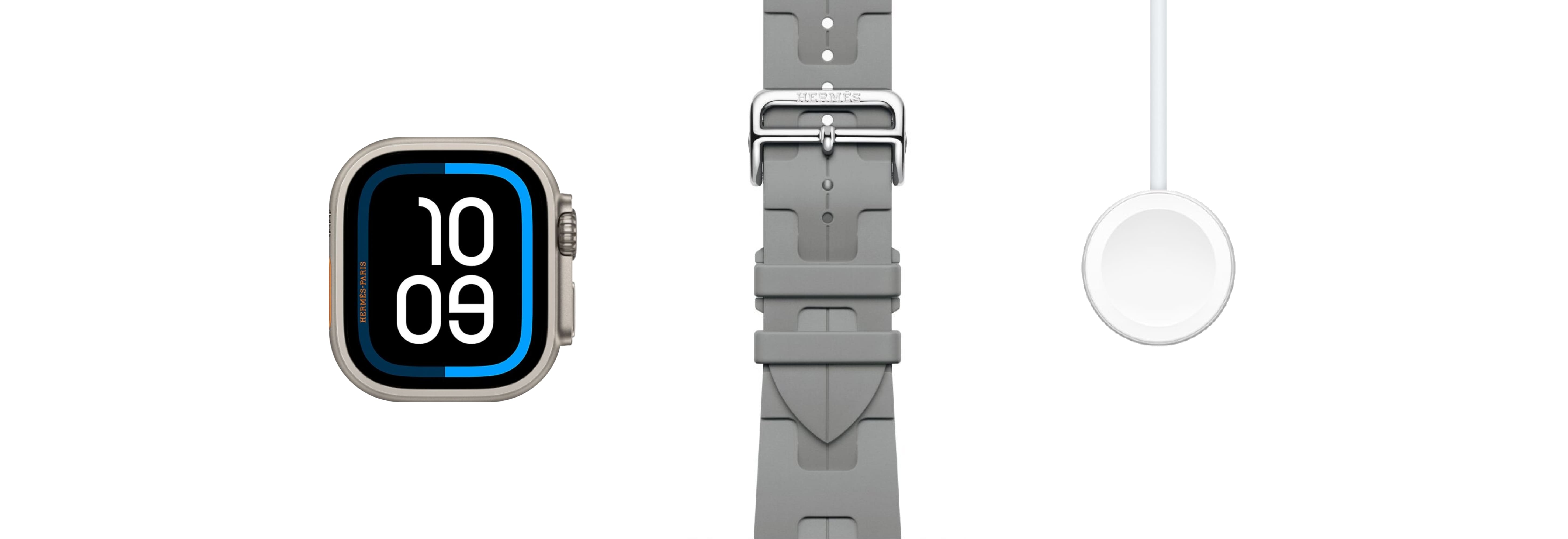 - Комплектация: Apple Watch Hermès Ultra 3, выбранный ремешок Hermès, кабель Apple Watch Magnetic Fast Charger to USB-C (1 м), документация