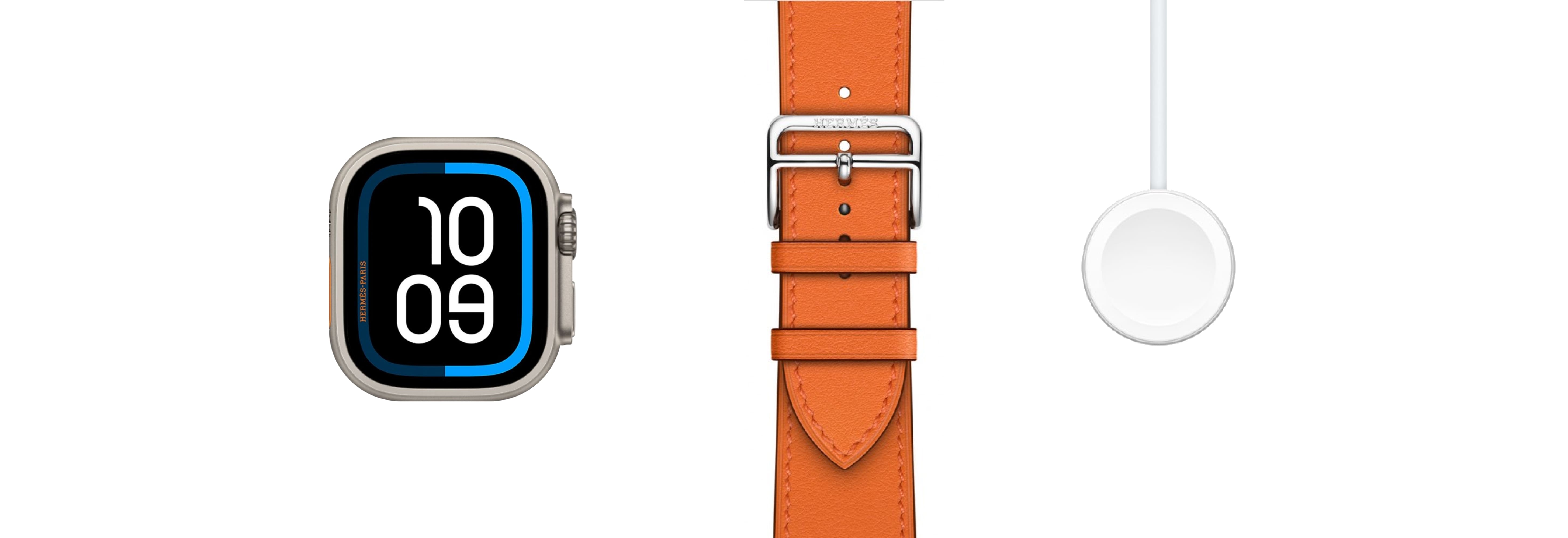 - Комплектация: Apple Watch Hermès Ultra 3, выбранный ремешок Hermès, кабель Apple Watch Magnetic Fast Charger to USB-C (1 м), документация