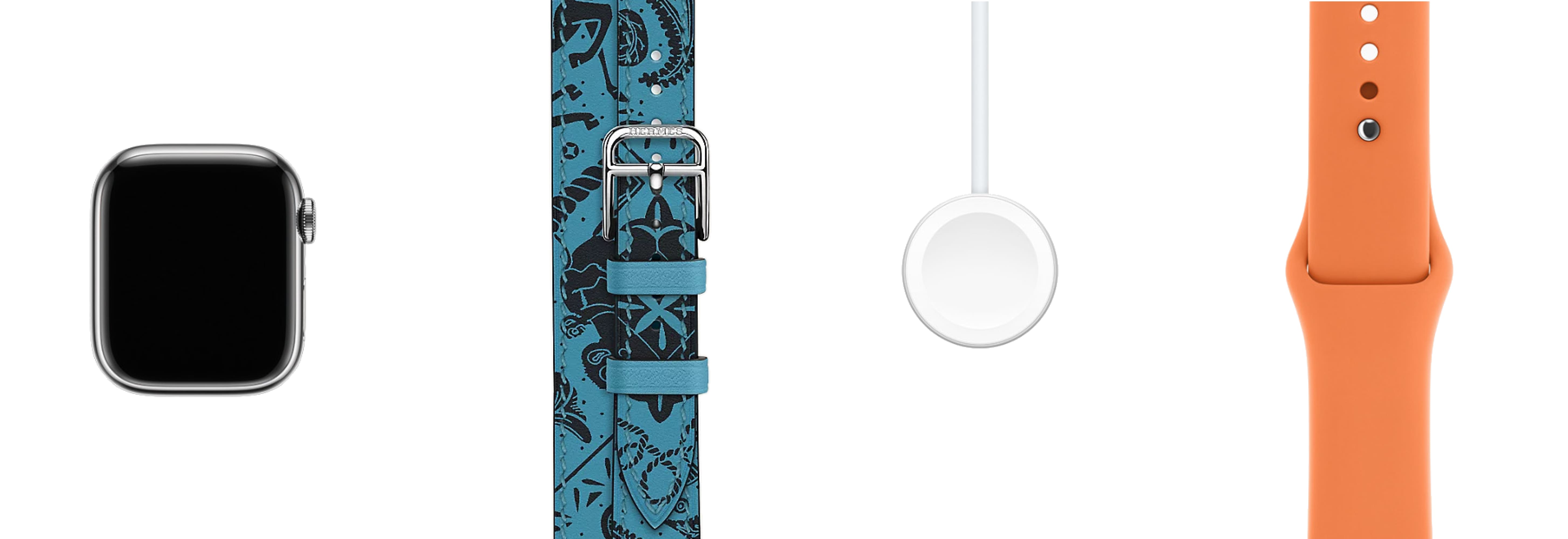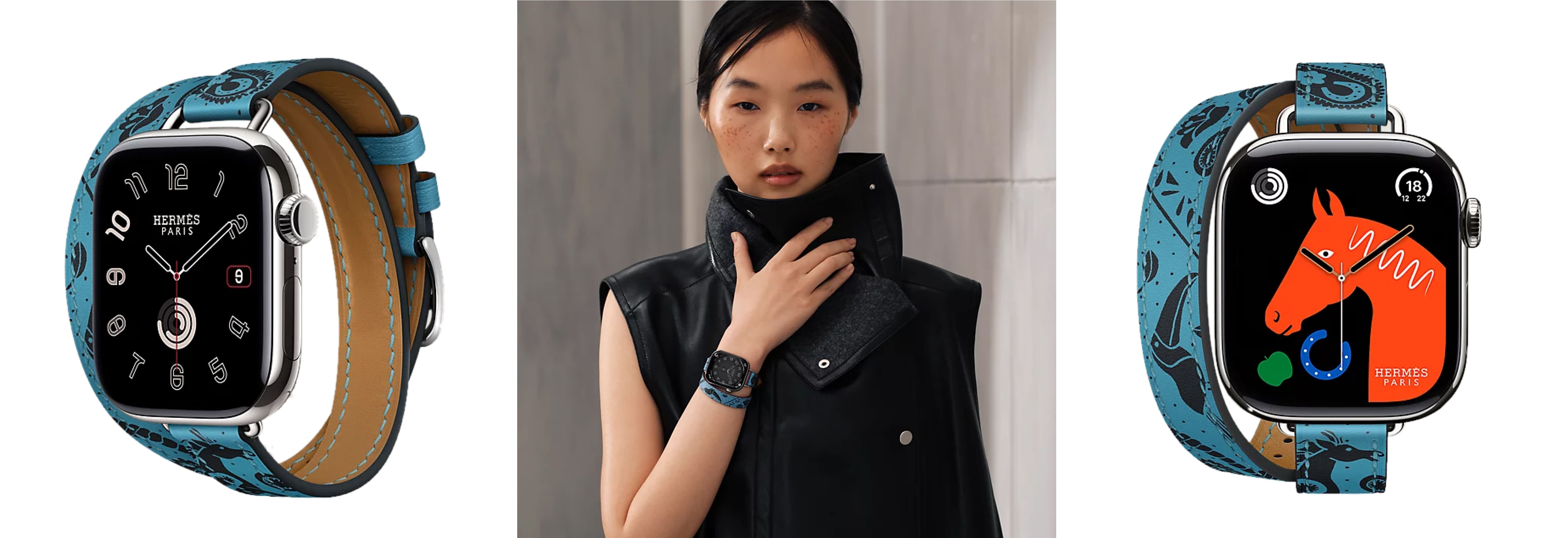 - Hermès-особенности: эксклюзивные циферблаты Hermès (в т.ч. Radial, Circulaire, Faubourg Party с 24 анимациями); фирменные ремешки Hermès (Kilim Single Tour, Satiné Grand H/Grand H Fin, Toile H Single Tour, Twill Jump Attelage и др.)