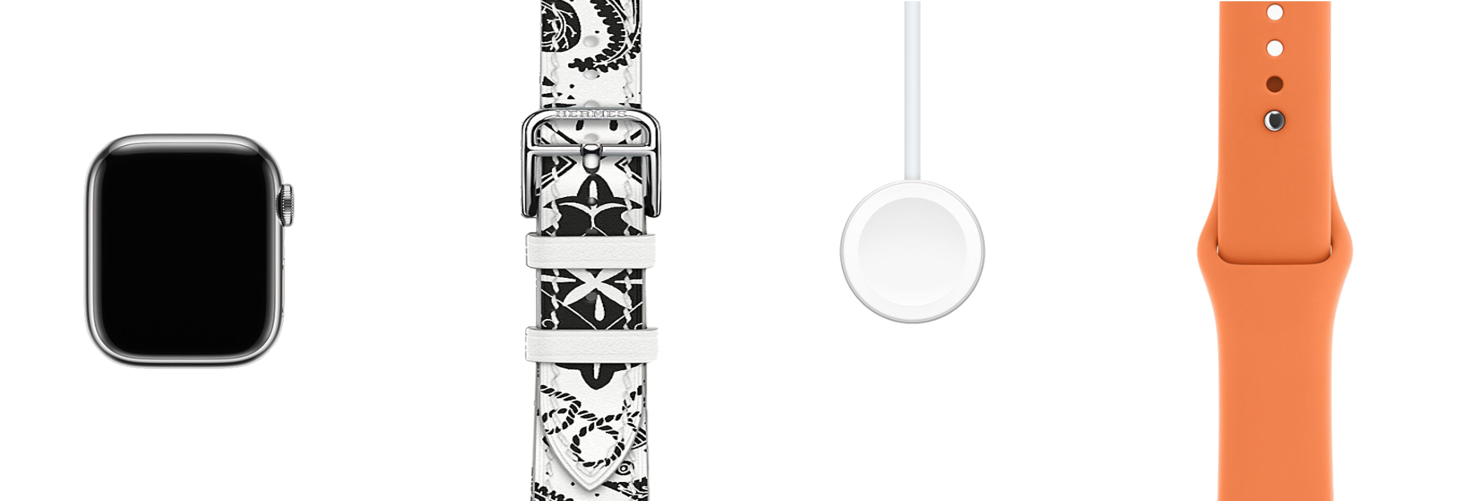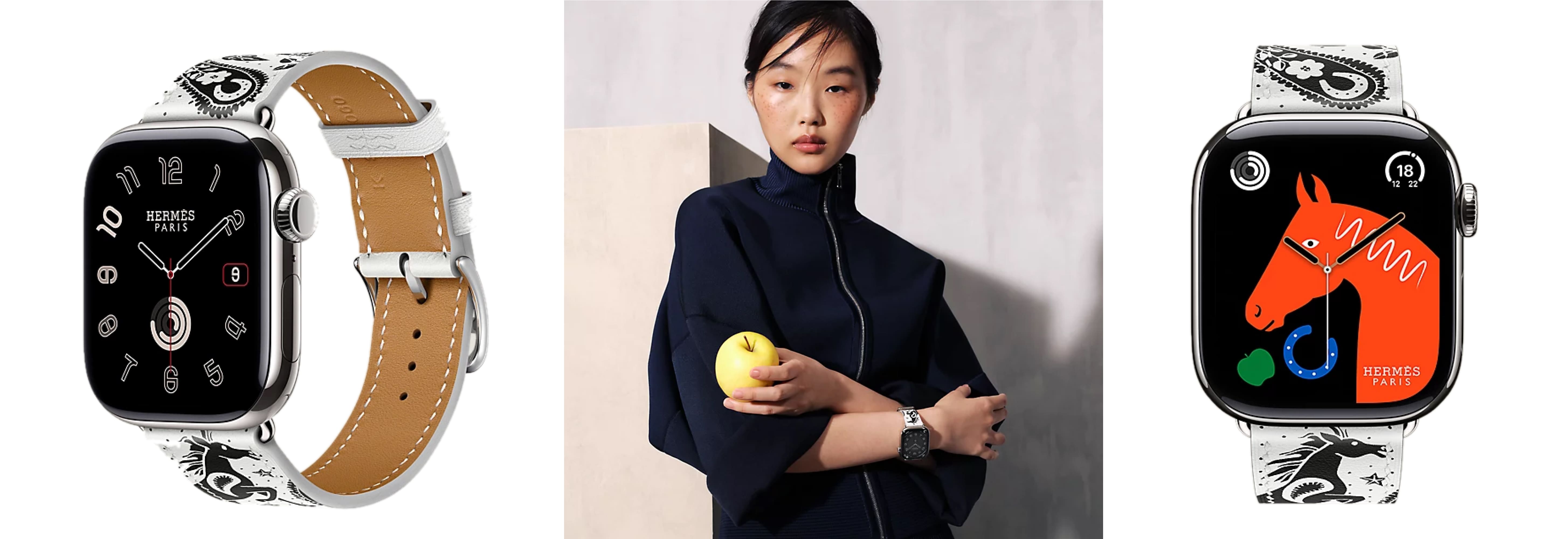 - Hermès-особенности: эксклюзивные циферблаты Hermès (в т.ч. Radial, Circulaire, Faubourg Party с 24 анимациями); фирменные ремешки Hermès (Kilim Single Tour, Satiné Grand H/Grand H Fin, Toile H Single Tour, Twill Jump Attelage и др.)