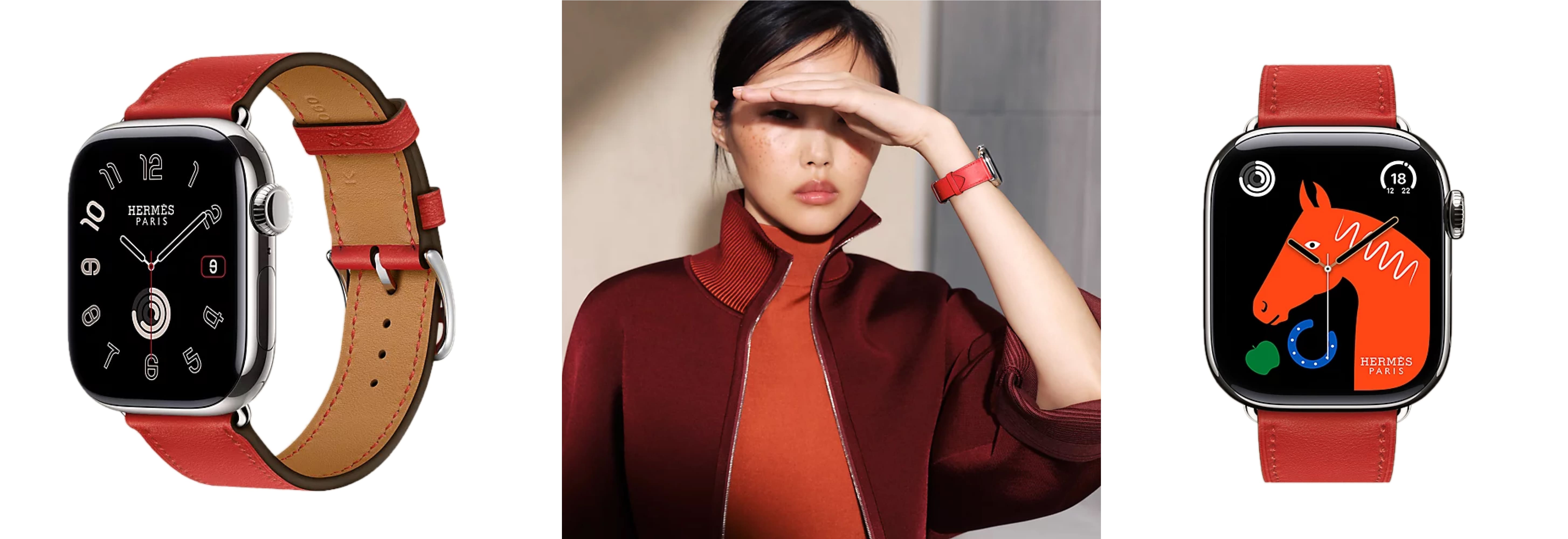 - Hermès-особенности: эксклюзивные циферблаты Hermès (в т.ч. Radial, Circulaire, Faubourg Party с 24 анимациями); фирменные ремешки Hermès (Kilim Single Tour, Satiné Grand H/Grand H Fin, Toile H Single Tour, Twill Jump Attelage и др.)