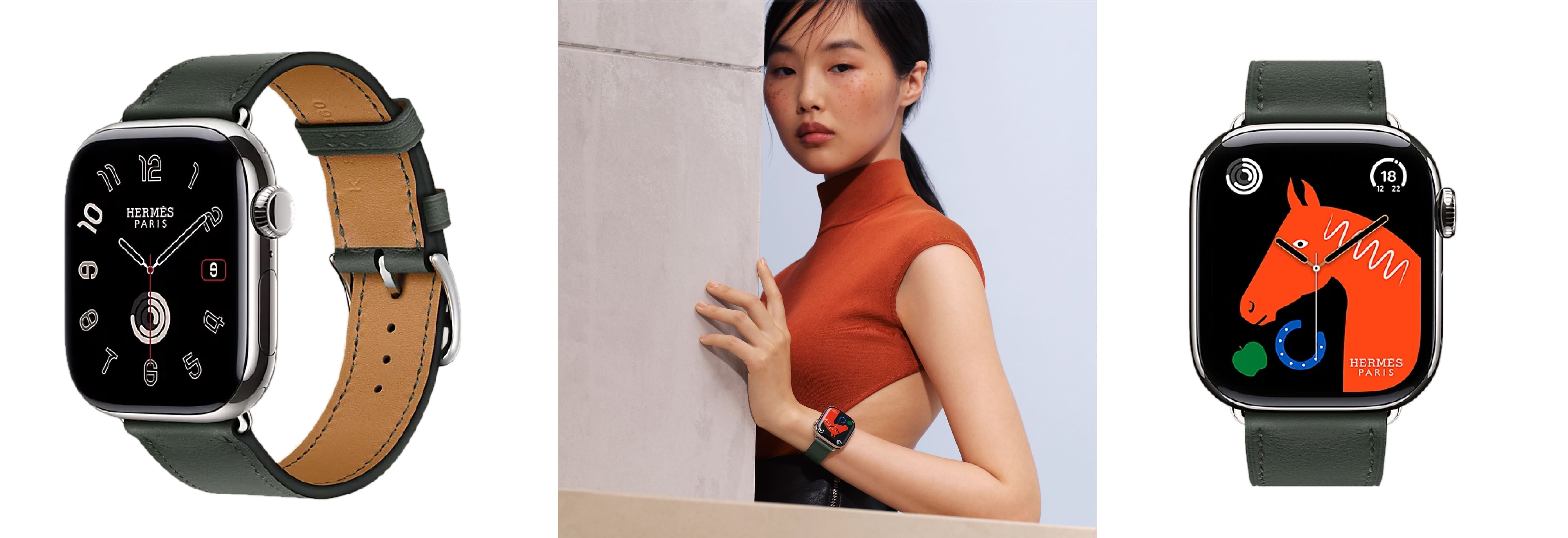 - Hermès-особенности: эксклюзивные циферблаты Hermès (в т.ч. Radial, Circulaire, Faubourg Party с 24 анимациями); фирменные ремешки Hermès (Kilim Single Tour, Satiné Grand H/Grand H Fin, Toile H Single Tour, Twill Jump Attelage и др.)