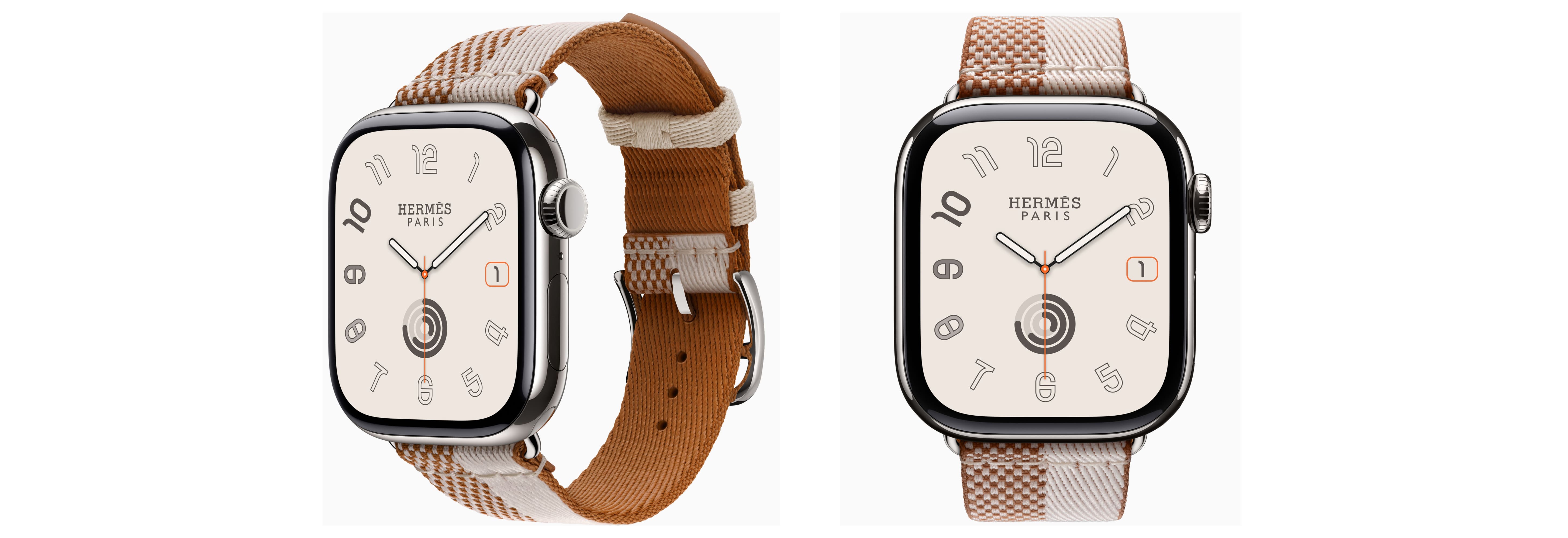 - Hermès-особенности: эксклюзивные циферблаты Hermès (в т.ч. Radial, Circulaire, Faubourg Party с 24 анимациями); фирменные ремешки Hermès (Kilim Single Tour, Satiné Grand H/Grand H Fin, Toile H Single Tour, Twill Jump Attelage и др.)