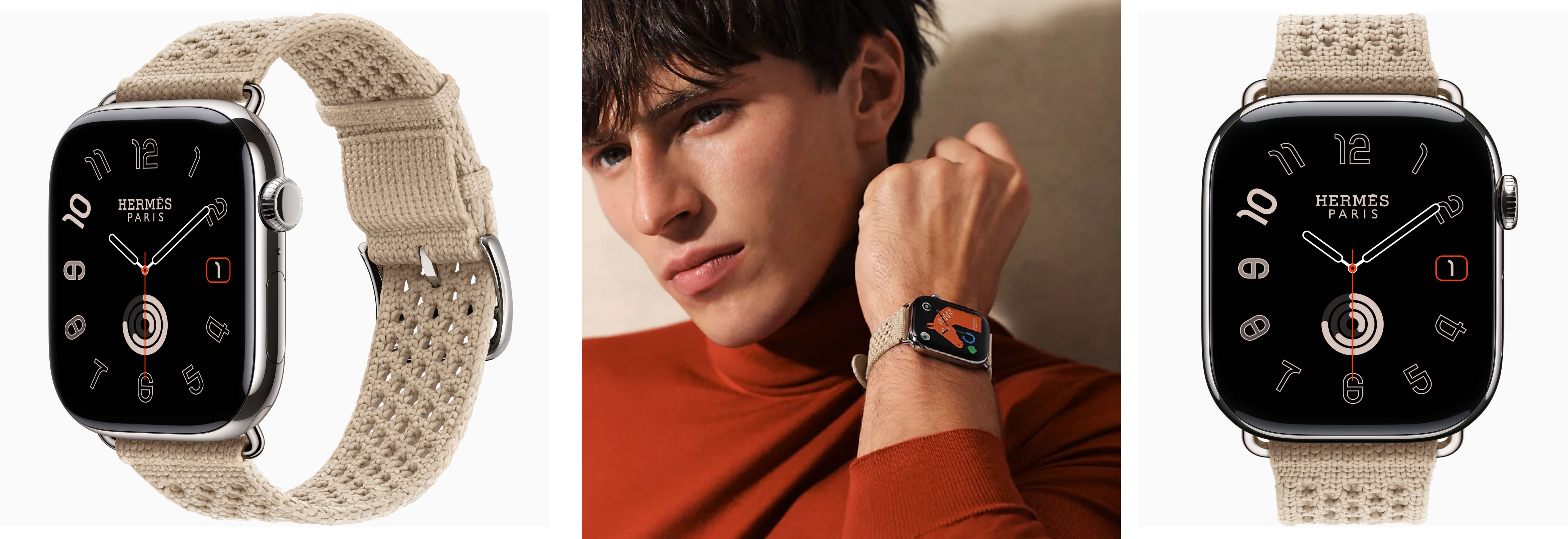 - Hermès-особенности: эксклюзивные циферблаты Hermès (в т.ч. Radial, Circulaire, Faubourg Party с 24 анимациями); фирменные ремешки Hermès (Kilim Single Tour, Satiné Grand H/Grand H Fin, Toile H Single Tour, Twill Jump Attelage и др.)
