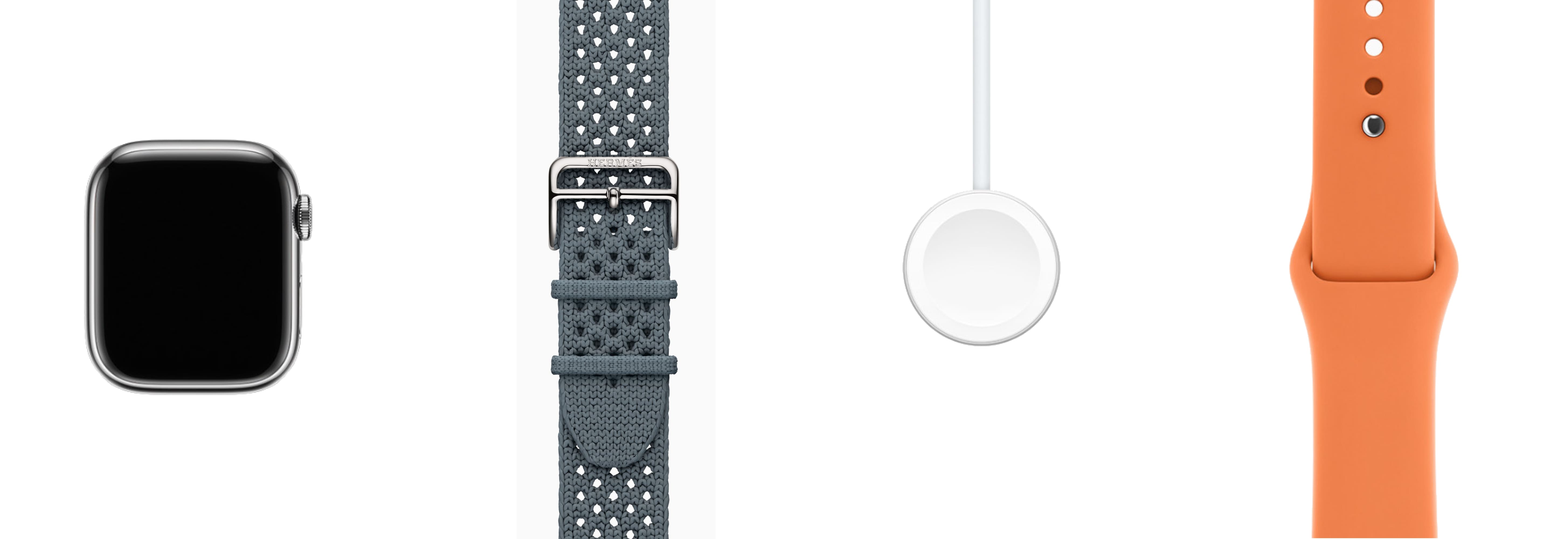 - Hermès-особенности: эксклюзивные циферблаты Hermès (в т.ч. Radial, Circulaire, Faubourg Party с 24 анимациями); фирменные ремешки Hermès (Kilim Single Tour, Satiné Grand H/Grand H Fin, Toile H Single Tour, Twill Jump Attelage и др.)