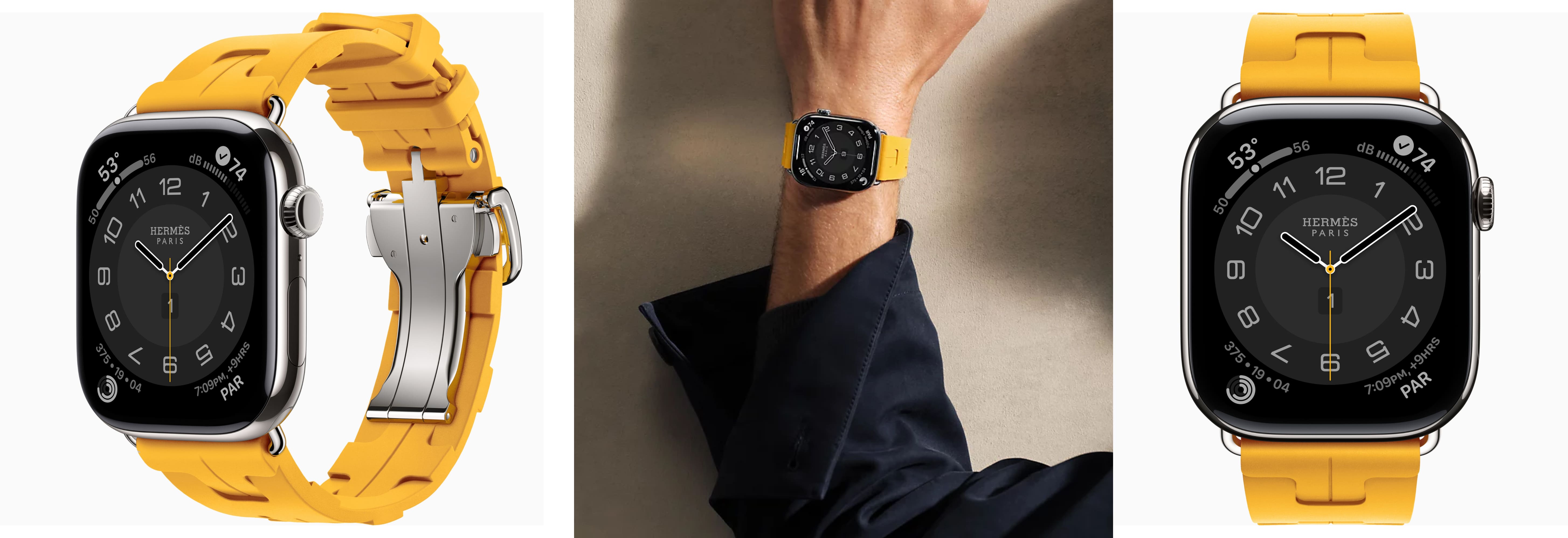 - Hermès-особенности: эксклюзивные циферблаты Hermès (в т.ч. Radial, Circulaire, Faubourg Party с 24 анимациями); фирменные ремешки Hermès (Kilim Single Tour, Satiné Grand H/Grand H Fin, Toile H Single Tour, Twill Jump Attelage и др.)