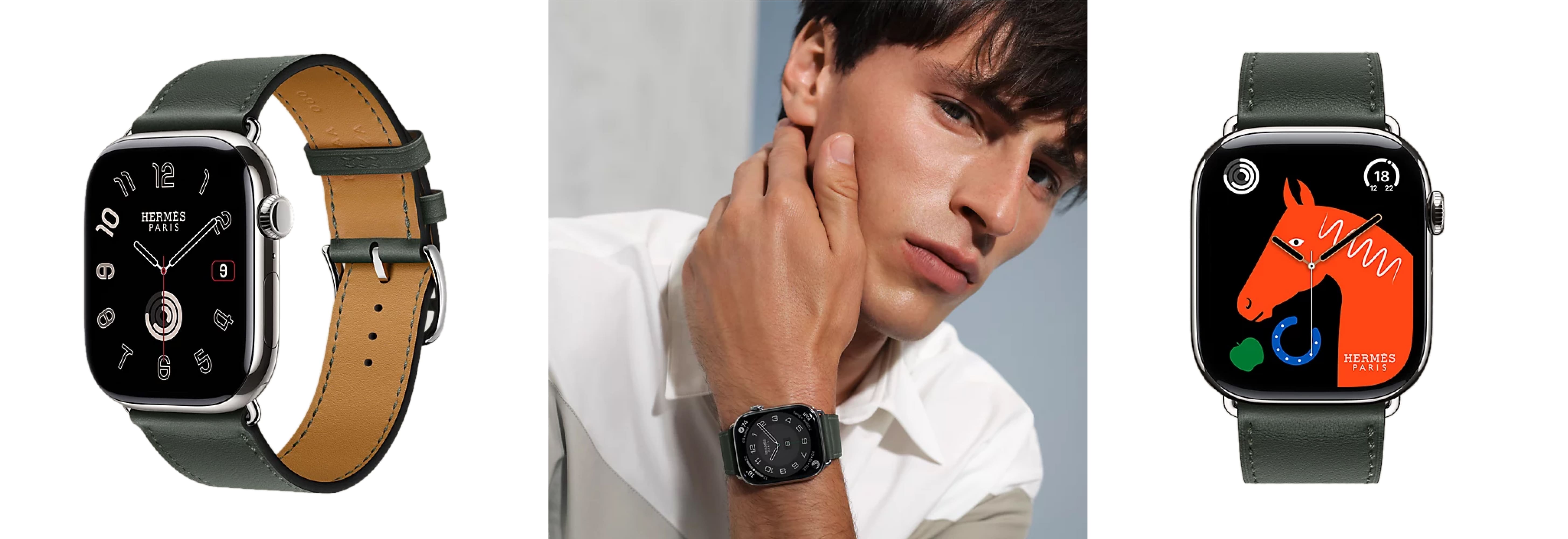 - Hermès-особенности: эксклюзивные циферблаты Hermès (в т.ч. Radial, Circulaire, Faubourg Party с 24 анимациями); фирменные ремешки Hermès (Kilim Single Tour, Satiné Grand H/Grand H Fin, Toile H Single Tour, Twill Jump Attelage и др.)