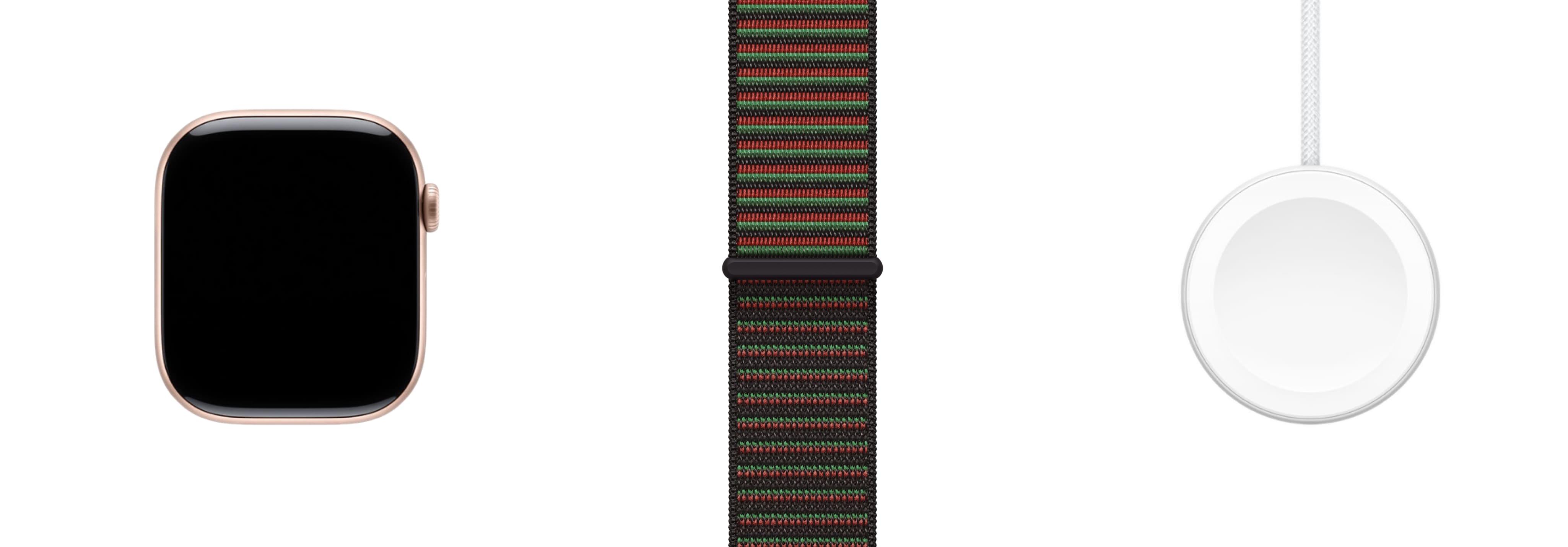 Apple Watch Series 11 42 мм, алюминиевые цвета розового золота, спортивный ремешок зелено-красного цвета