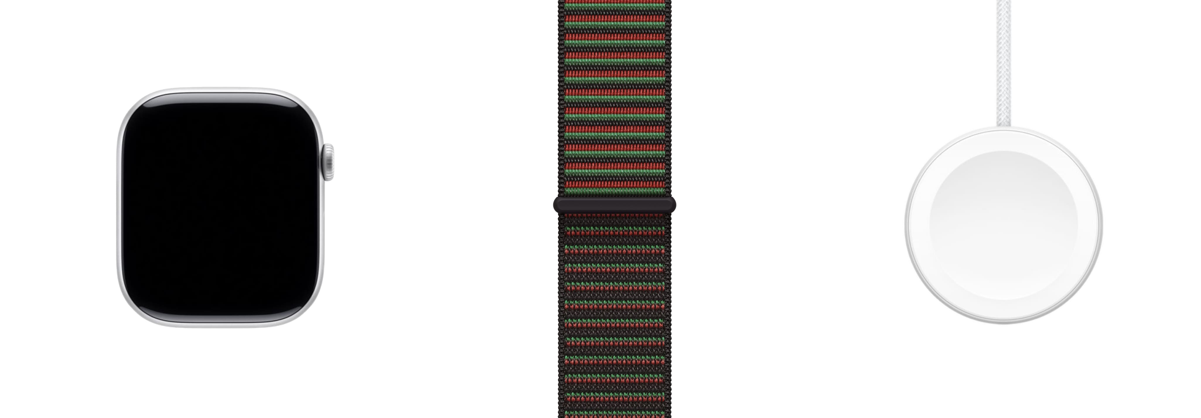 Apple Watch Series 11 42 мм, алюминиевые серебристого цвета, спортивный ремешок зелено-красного цвета