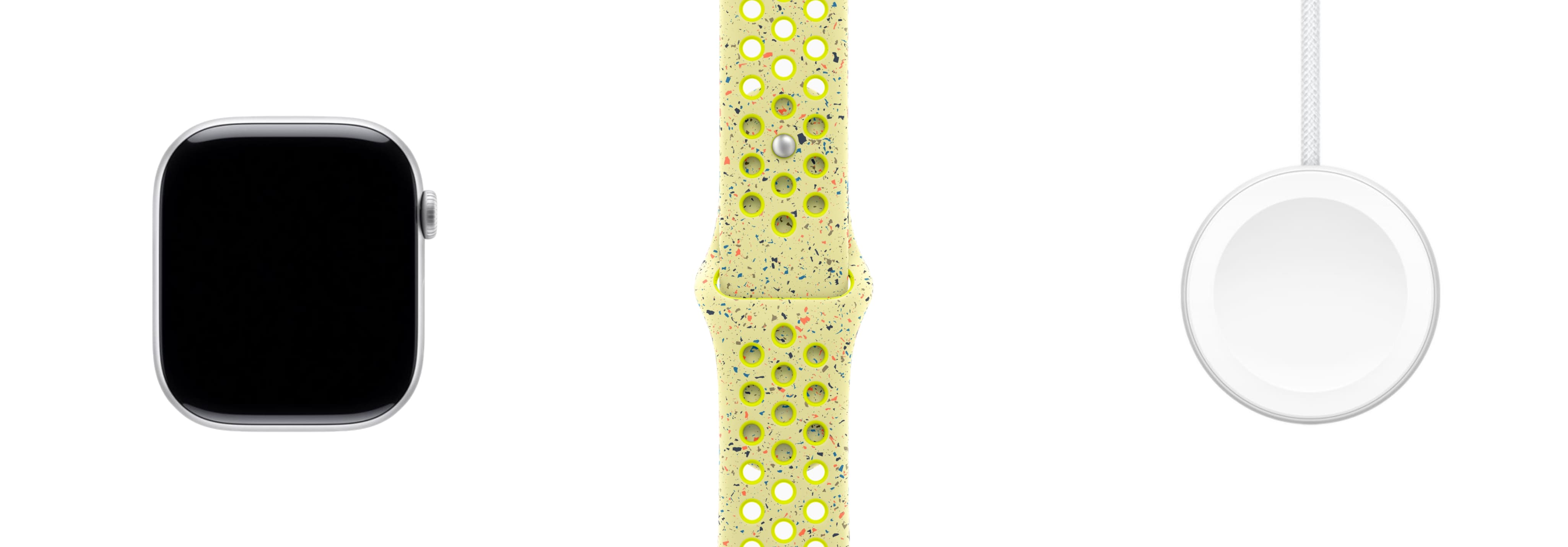Корпус из алюминия серебристого цвета 42 мм, спортивный ремешок Nike желтого цвета (140-210мм), магнитный зарядный кабель 1м