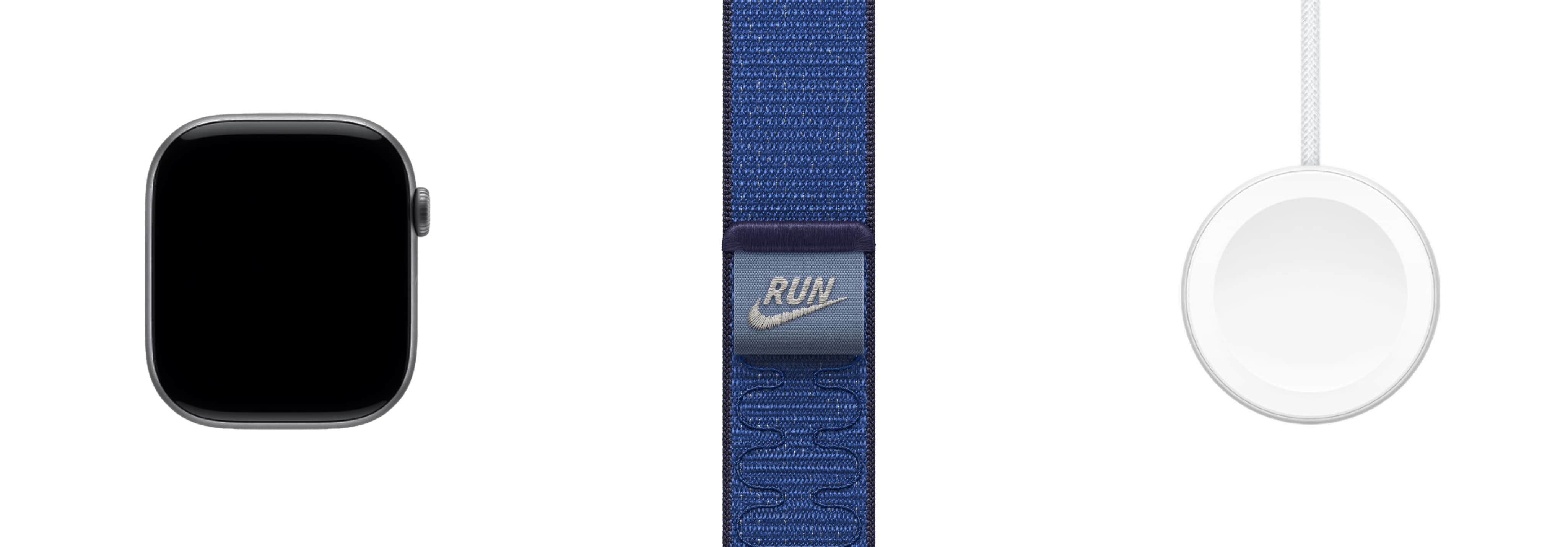 Корпус из серого алюминия 46 мм, спортивный ремешок Nike Sport Loop голубого цвета (145-220мм), магнитный зарядный кабель 1м
