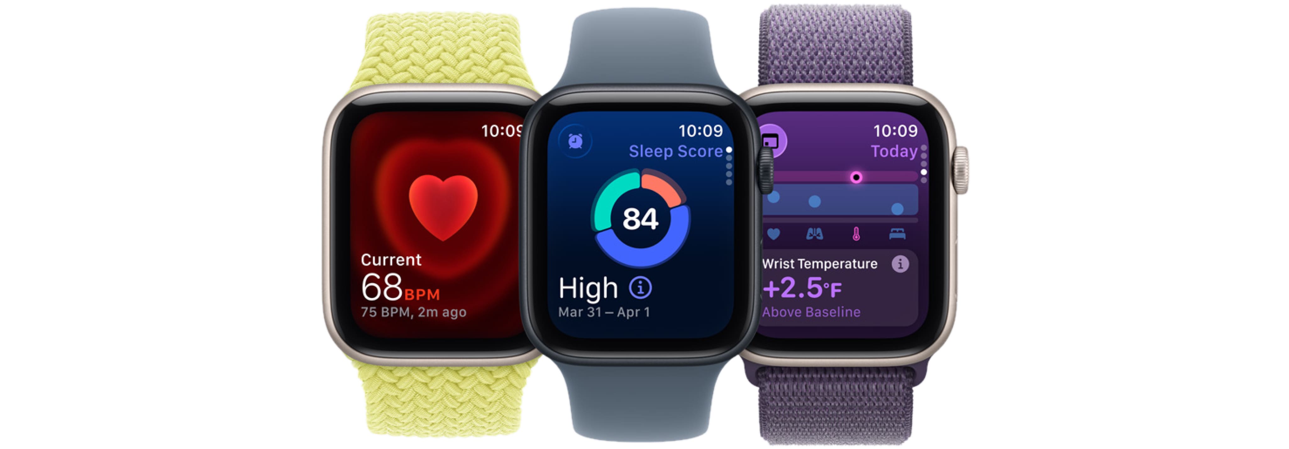- Датчики и здоровье: оптический датчик сердечного ритма; уведомления о нерегулярном ритме; отслеживание сна со стадиями; температурные тренды на запястье
