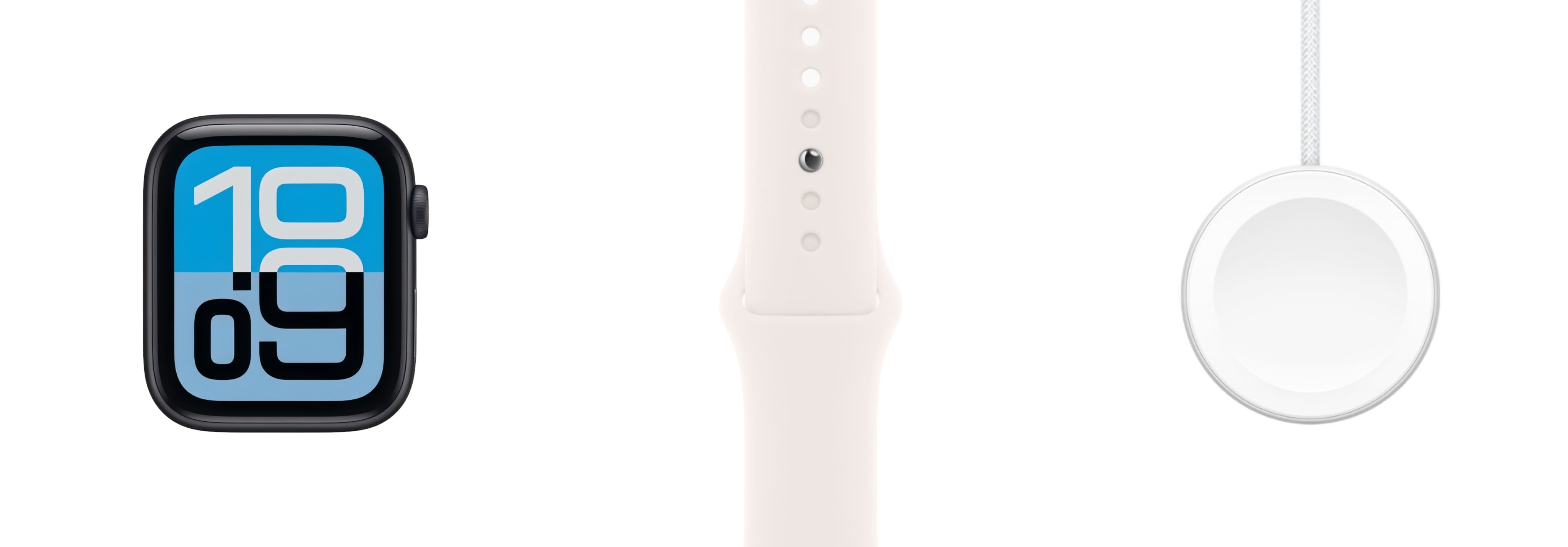 Ремешок Sport Band из мягкого фторэластомера дополняет сценарии тренировок: он приятен к коже, не боится влаги и легко очищается. Фирменная застёжка pin-and-tuck фиксируется быстро и надёжно без выступающих элементов — удобно при силовых упражнениях, беге или повседневной носке. В сумме SE 3 — это сбалансированный вход в экосистему Apple Watch: достаточно функций здоровья и безопасности, современный дисплей и плавная работа интерфейса.