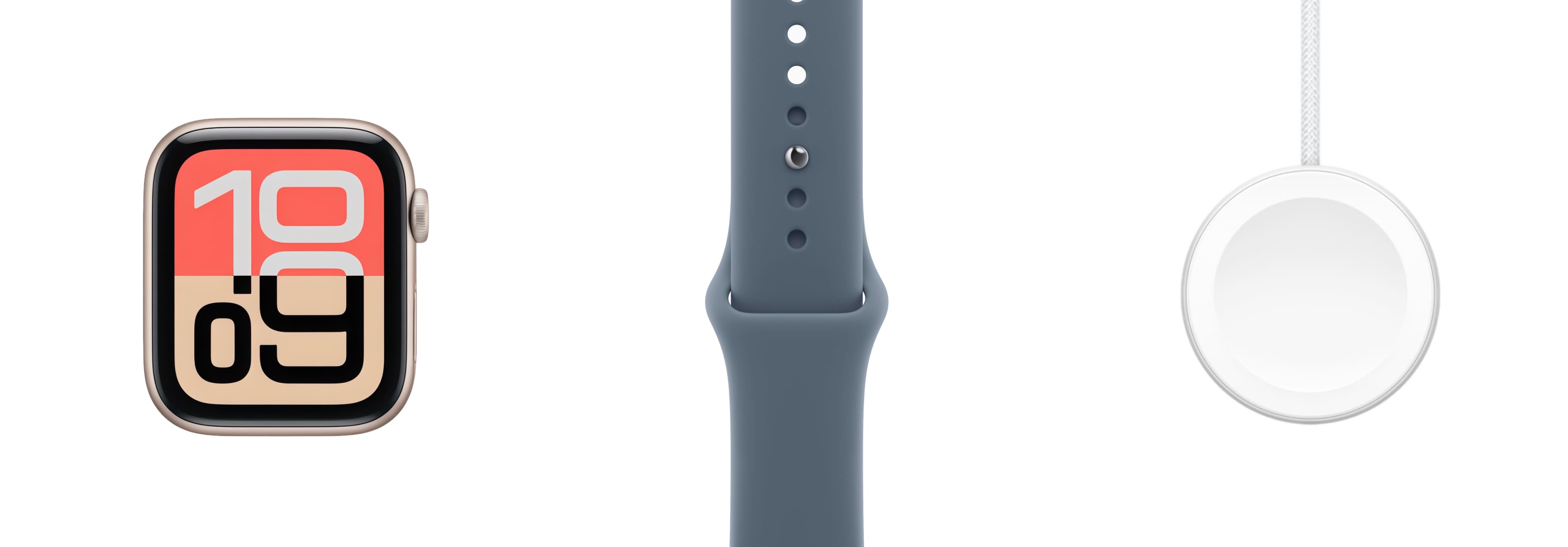 Ремешок Sport Band из мягкого фторэластомера дополняет сценарии тренировок: он приятен к коже, не боится влаги и легко очищается. Фирменная застёжка pin-and-tuck фиксируется быстро и надёжно без выступающих элементов — удобно при силовых упражнениях, беге или повседневной носке. В сумме SE 3 — это сбалансированный вход в экосистему Apple Watch: достаточно функций здоровья и безопасности, современный дисплей и плавная работа интерфейса.