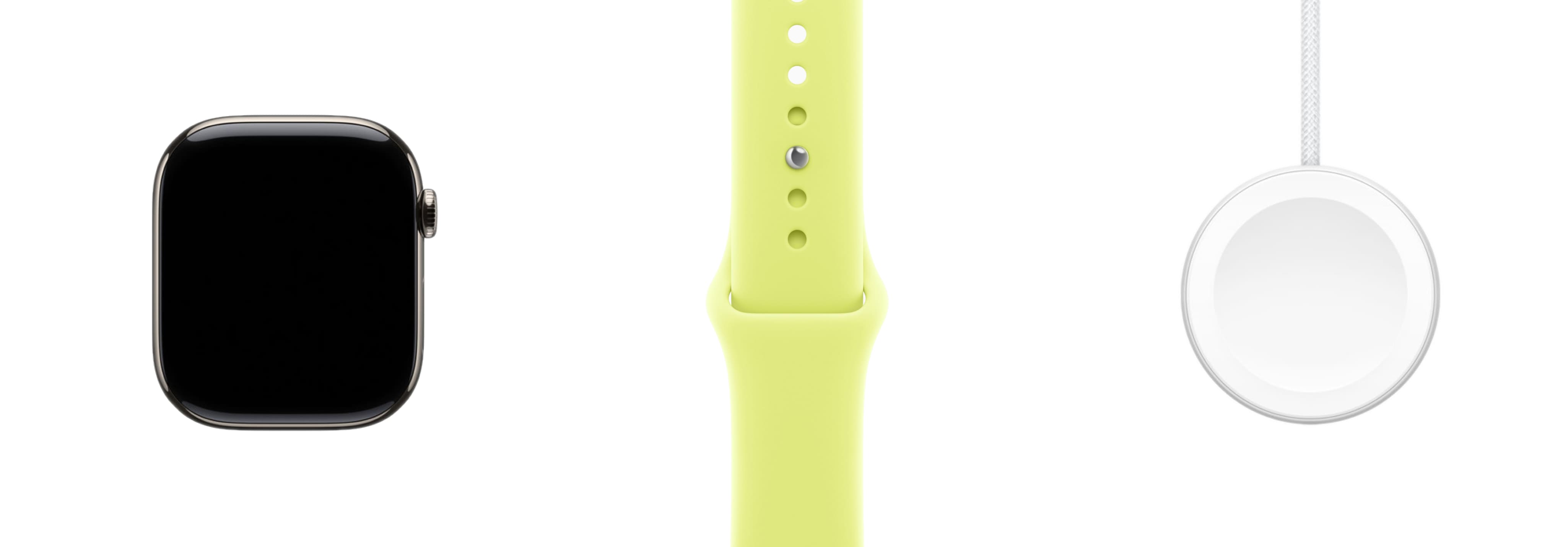 Apple Watch Series 11 42 мм, титановые натуральные, силиконовый спортивный ремешок желтого неонового цвета