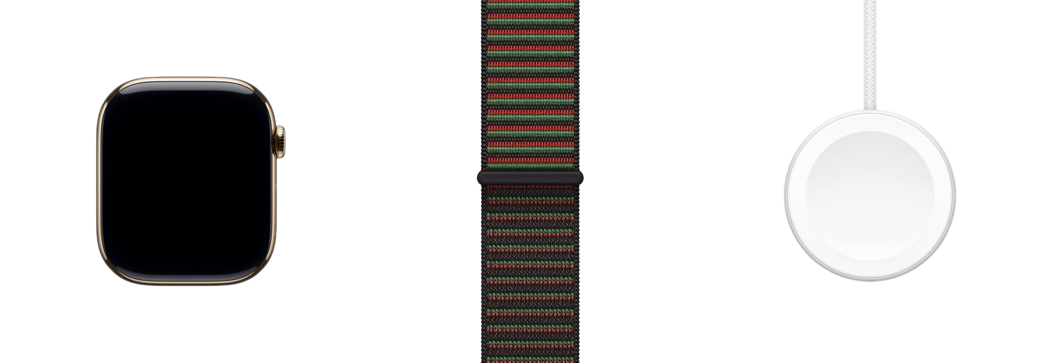 Apple Watch Series 11 46 мм, титановые золотые, спортивный ремешок зелено-красного цвета