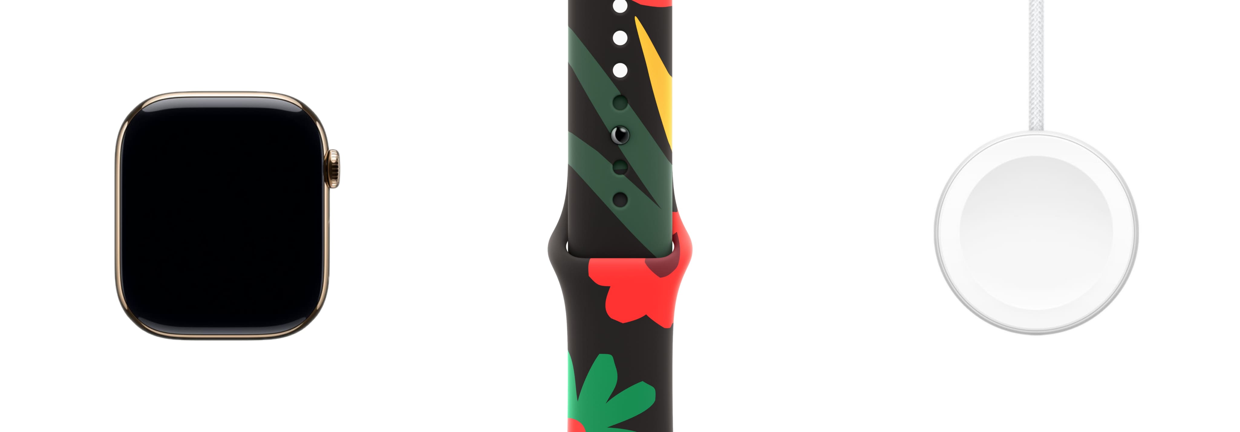 Apple Watch Series 11 46 мм, титановые золотые, силиконовый спортивный ремешок черного цвета с цветочным принтом