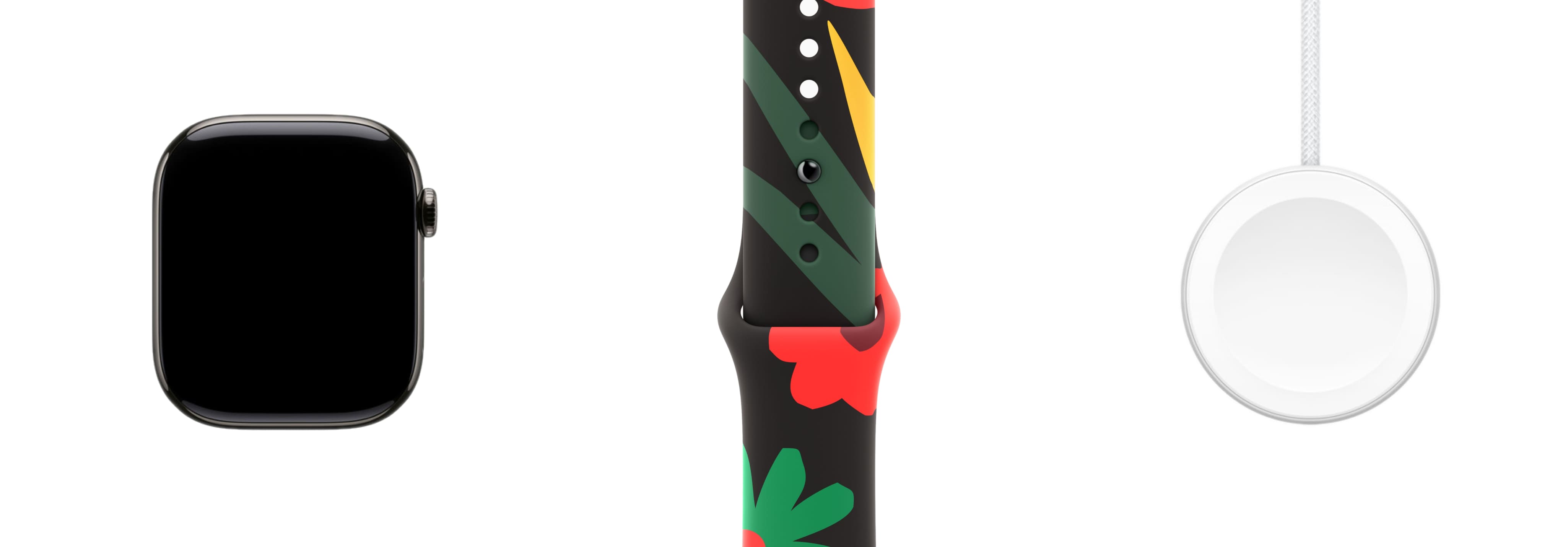 Корпус из черного титана 46 мм, спортивный ремешок черного цвета с цветочным принтом (140-210 мм), магнитный зарядный кабель 1м